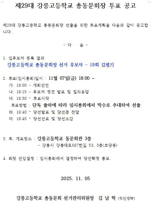 따라서 김남학(18회) 강릉고동문회 선거관리위원장은 임시총회(11월 7일 저녁 6시 00분)에서 투표로 29대 강릉고동문회장 선거를 아래와 같이 실시하기로 하였습니다.